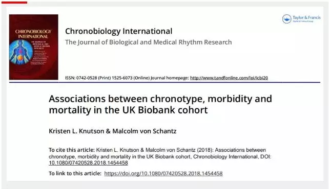 這項(xiàng)基于英國(guó)生物庫中將近50萬人樣本的研究發(fā)現(xiàn),晚上不睡早晨起不來的人比早睡早起的人死亡風(fēng)險(xiǎn)高出10%。在研究樣本中,有5萬人在這為期6.5年的采樣過程中死亡可能性更高。