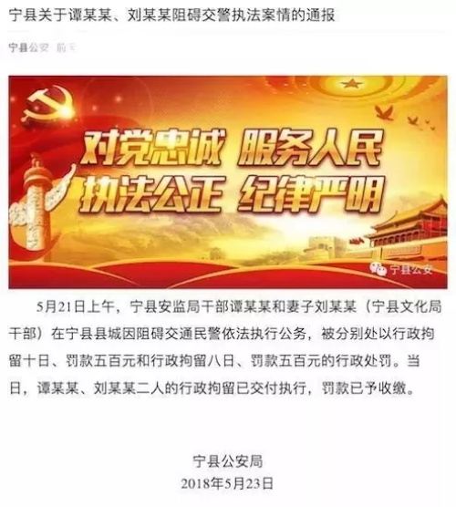 5月23日,寧縣公安局官方微信公眾號(hào)“寧縣公安”通報(bào)稱,5月21日上午,寧縣安監(jiān)局(注:全稱為寧縣******生產(chǎn)監(jiān)督管理局)干部譚某某和妻子劉某某(寧縣文化局干部)在寧縣縣城因阻礙交通民警依法執(zhí)行公務(wù),被分別處以行政拘留10日、罰款500元和行政拘留8日、罰款500元的行政處罰。當(dāng)日,譚某某、劉某某二人的行政拘留已交付執(zhí)行,罰款已予收繳。