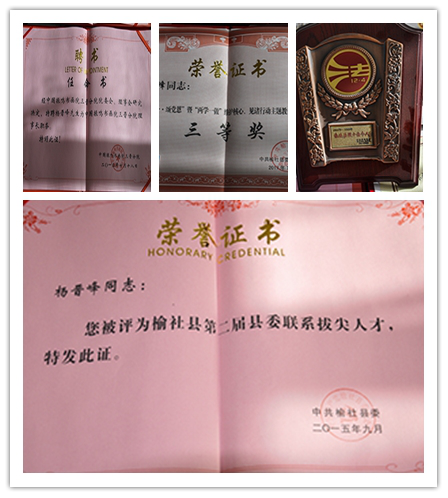 楊老在精神文明傳播方面極大的貢獻和成績,讓同鄉(xiāng)人無不稱贊。更有《山西日報》、《晉中日報》以題為《山區(qū)文化人》、《為了一方熱土的平安》為題報道了楊晉峰同志的工作事跡。他曾被評為“******科研項目民間藝術挖掘整理貢獻獎”、“省級先進文化工作者”、“精神文明突擊手”稱號,曾獲得過省、市書法******作品、市“人口杯”文藝創(chuàng)作精品獎勵等。