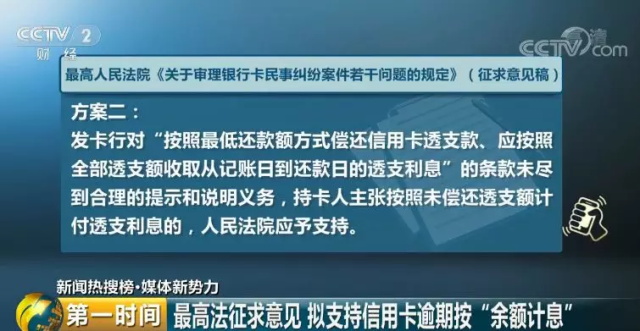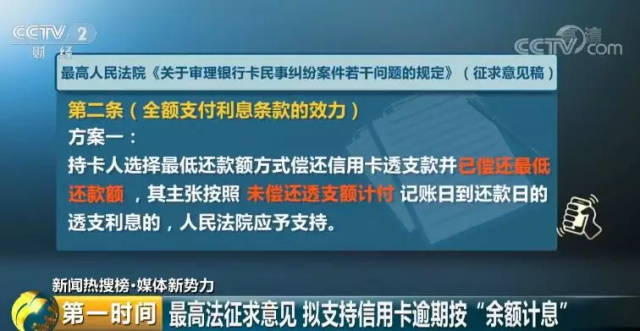 現(xiàn)在信用卡用戶迎來了一個好消息,近日,******人民法院發(fā)布了一份征求意見稿。其中,關(guān)于信用卡逾期計息問題,******法擬支持按“余額計息”。本次征求意見截止日期為2018年6月30日。