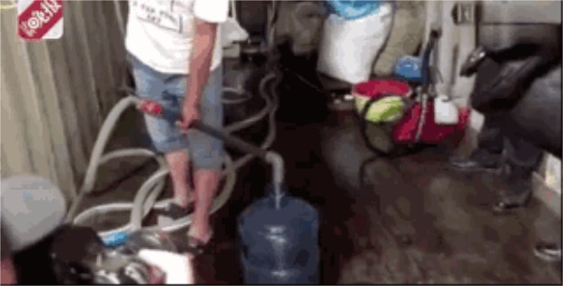 開啟抽水泵,通過(guò)水管將空桶灌滿水,徒手從麻袋里撿起一個(gè)桶蓋蓋上,找到和桶對(duì)應(yīng)的商標(biāo)包裹住蓋子,將特制的小鐵缸加熱,往商標(biāo)上一扣,商標(biāo)被塑封在桶上。不過(guò)1分鐘時(shí)間,一桶封裝好的某品牌桶裝水就灌裝完成了。而這樣的桶裝水,任某******能生產(chǎn)二、三百桶。