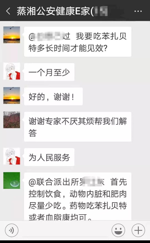 在做優(yōu)硬件的同時(shí),蒸湘分局還建立了“蒸湘公安健康E家”微信群,并邀請(qǐng)衡陽市中心醫(yī)院副院長、心血管專家劉小平教授,南華附一醫(yī)院心血管內(nèi)科主任劉廠輝教授和韶關(guān)市人民醫(yī)院糖尿病科主任鄧國寶教授入群指導(dǎo),向民警提供科學(xué)建議、用藥咨詢和線下會(huì)診,為民警尋醫(yī)問診提供了極大的方便。
