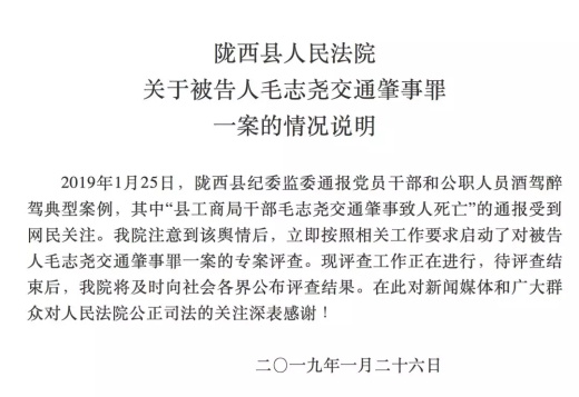 1月26日,隴西縣人民法院通過(guò)其官方微信公號(hào)作出情況說(shuō)明稱,該院注意到該輿情后,立即按照相關(guān)工作要求啟動(dòng)了對(duì)被告人毛志堯交通肇事罪一案的專案評(píng)查?,F(xiàn)評(píng)查工作正在進(jìn)行,待評(píng)查結(jié)束后,該院將及時(shí)向社會(huì)各界公布評(píng)查結(jié)果。