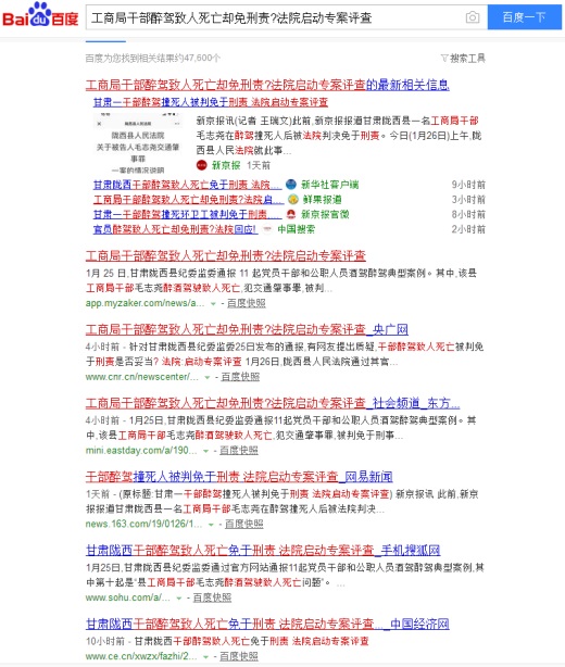 1月25日,甘肅隴西縣紀(jì)委監(jiān)委通報(bào)11起黨員干部和公職人員酒駕醉駕典型案例。其中,該縣工商局干部毛志堯醉酒駕駛致人死亡,犯交通肇事罪,被判免于刑事處罰。此事遭到網(wǎng)友質(zhì)疑。26日,隴西縣人民法院作出情況說(shuō)明稱,已啟動(dòng)對(duì)被告人毛志堯交通肇事罪一案的專案評(píng)查。