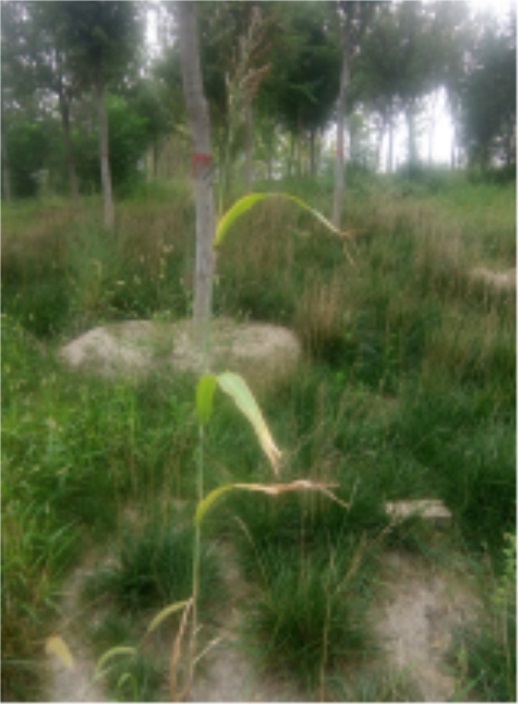 7月23日,在北邊距離土丘大約千米的一棵枯樹下發(fā)現(xiàn)一叢約15棵大小不齊的苗子,都與野蒿和蘆葦混長在一起。這些苗子都嚴(yán)重蔫萎干枯。稍南,又發(fā)現(xiàn)一棵較大的,旁邊也是蒿草。