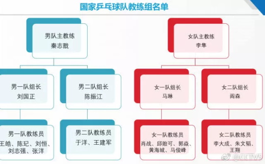 今天,中國乒協(xié)還公布了新一屆******隊(duì)教練組名單,男女隊(duì)主教練分別為秦志戩和李隼,男女一隊(duì)組長分別為劉國正和馬琳。新一屆中國乒乓球隊(duì),首次采用主教練、組長雙軌制負(fù)責(zé)制。主教練為******責(zé)任人,組長為第二責(zé)任人。