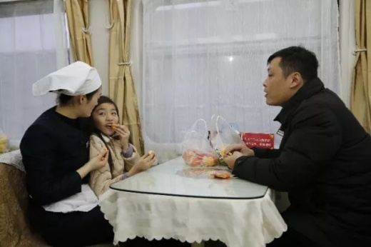 2月14日,蘆楊帶著女兒到K91次列車(chē)餐車(chē)看望妻子李楠。新華社發(fā)