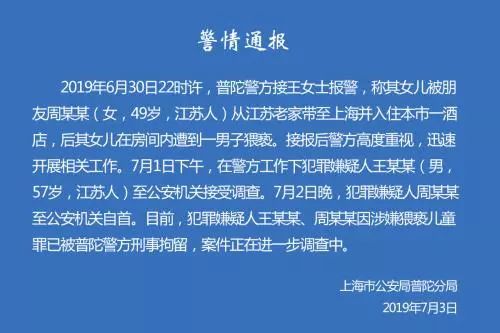 3日晚間,上海警方發(fā)布通報(bào)稱,2019年6月30日22時(shí)許,上海普陀警方接王女士報(bào)警,稱其女兒被朋友周某某(女,49歲,江蘇人)從江蘇老家?guī)е辽虾2⑷胱”臼幸痪频?,后其女兒在房間內(nèi)遭到一男子猥褻。接報(bào)后警方高度重視,迅速開展相關(guān)工作。