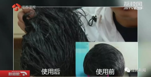 按照使用說明,記者戴上手套將產(chǎn)品涂抹于假發(fā)套上,20分鐘后用清水洗凈,本來是花白頭發(fā)的假發(fā)套果然瞬間變黑了。