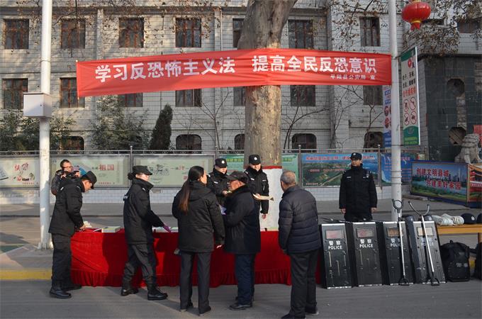 為普及《反恐怖主義法》,******推進(jìn)依法反恐,教育公民遵法守法,自覺抵御恐怖主義思想侵害,積極配合參與反恐怖工作,12月27日,平陸縣公安局組織巡特警大隊(duì)、警務(wù)保障室、信通中心、辦公室全體民警走上街頭,開展了“學(xué)習(xí)反恐怖主義法,提高全民反恐意識”為主題的宣傳活動,縣委常委、政法委書記、縣反恐怖領(lǐng)導(dǎo)小組組長段毅平,副縣長、公安局局長、縣反恐怖領(lǐng)導(dǎo)小組副組長樊宇江,縣反恐辦辦公室主任、公安局副局長郭紅軍對活動進(jìn)行了現(xiàn)場督導(dǎo)。