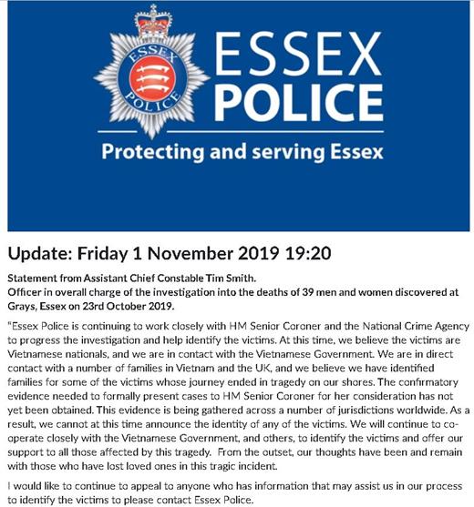 警方稱,他們正與越南政府進(jìn)行聯(lián)絡(luò),并同多個(gè)越南和英國(guó)的家庭進(jìn)行了直接接觸,相信他們已經(jīng)辨別出一些遇難人員的身份。確認(rèn)身份的證據(jù)還需要正式提交給英國(guó)驗(yàn)尸官辦公室;因此,目前警方還不能公布任何遇難者的身份。