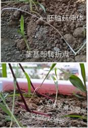 這次試驗,在報告里有各種數(shù)據(jù)都列表統(tǒng)計。為了讓讀者直觀地看清什么是“軸延體”(有人稱“中胚軸”或“根莖”),我選了兩張照片作成拼圖(圖6的上、下)。