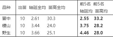 試驗時間:2020.9.20.—11.03.歷時44天。是找到晉中高粱后,還不知道能不能找到稷山的黍。就用周坡來代替。數(shù)據(jù)在手機備忘錄里有詳細(xì)記錄。下面僅把出苗數(shù)、平均軸延長度和平均苗高列表如下: