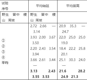 從表中可以看出:晉中高粱的軸延體明顯比其它都短,其它都﹥3,而它﹤3?,F(xiàn)在用它跟其它3種比較,所占百分比分別為:是稷山的68.5%;周坡的68.8%;野生的77.6%。苗高則為晉中﹥野生﹥周坡﹥稷山。