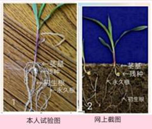 試驗結果:①玉米的軸延體:短、粗、壯,長度0.5-2.8cm;不定根:早、多、短、粗、壯。②高粱相反,軸延體:長、細、弱,長度3.0-4.0cm;不定根:晚、少、長、細、弱。