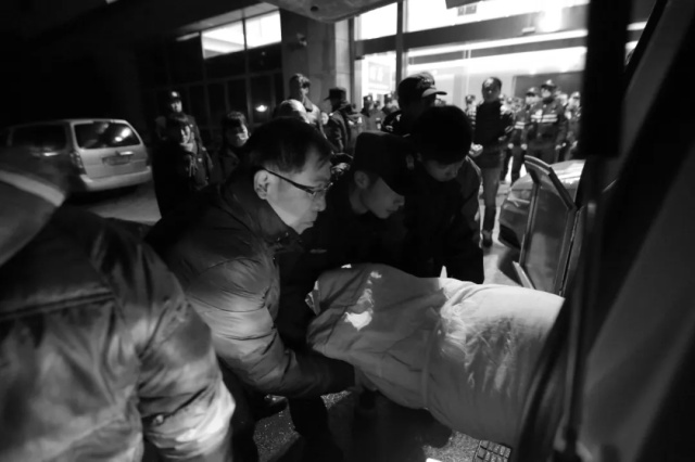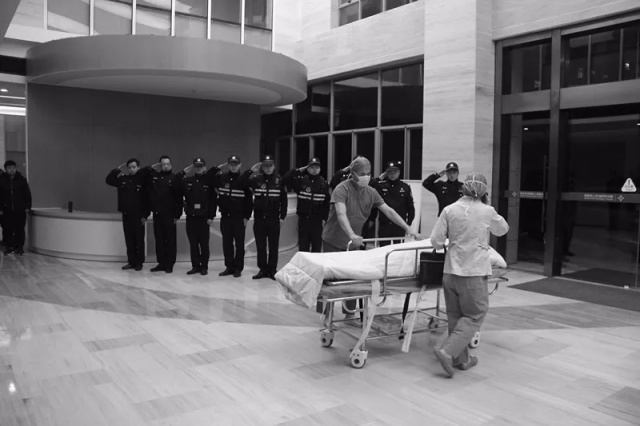 1月26日19時(shí)07分,40余名楊建軍同志的生前戰(zhàn)友,共同佇立在住院部的一樓,眼中噙著淚水,靜靜等待著楊建軍同志的遺體到來?!岸!?,電梯門緩緩打開,醫(yī)生推著病床走出電梯,病床上躺著一具用被褥包裹著的遺體。瞬間,全體戰(zhàn)友再也抑制不住內(nèi)心的悲痛,淚水從眼眶涌出。